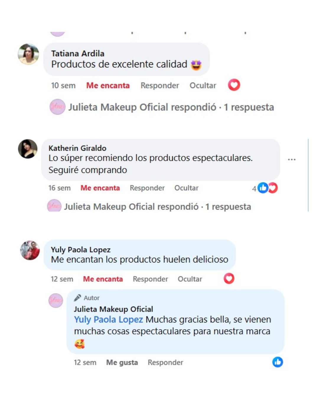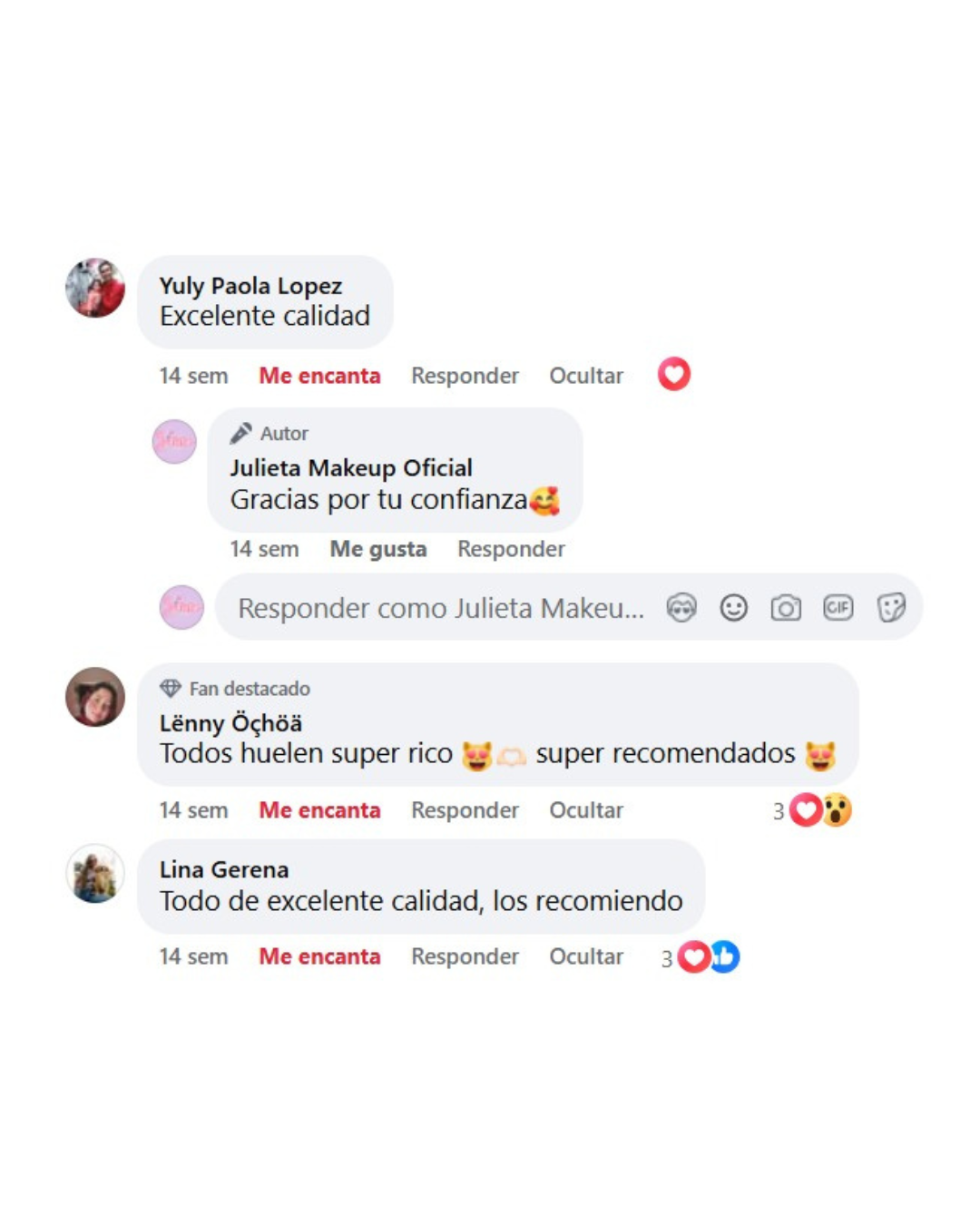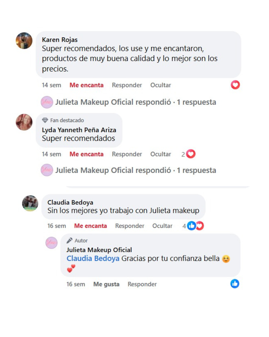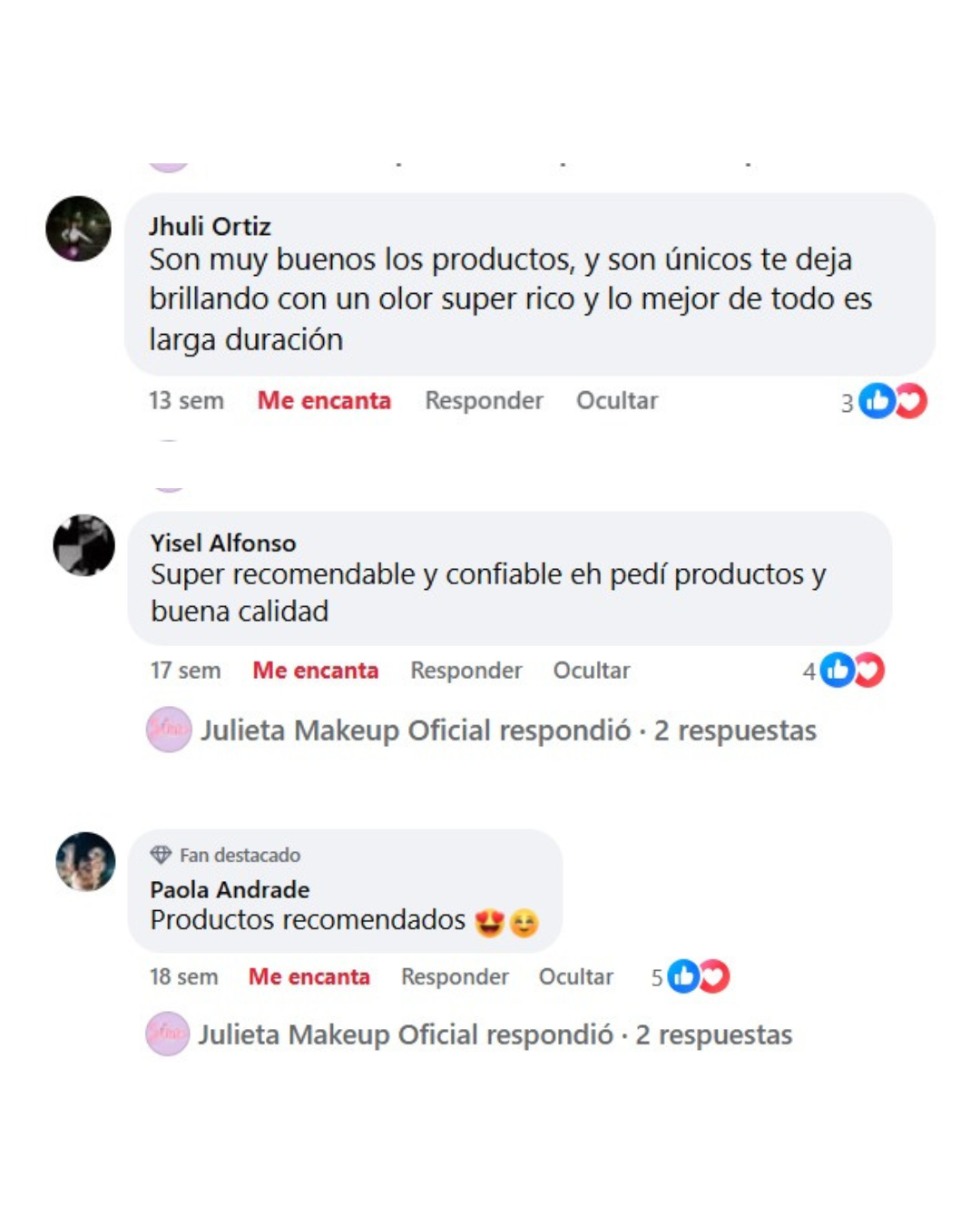 En Julieta Makeup, la calidad no es solo cómo te ves, sino cómo te sientes. Hemos diseñado fórmulas premium con alta pigmentación y texturas ligeras que cuidan tu piel mientras resaltan tu brillo natural. Disfruta de acabados profesionales con aromas irresistibles que hacen de tu rutina un momento de puro lujo y amor propio.
